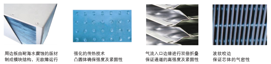 1、熱交換器表面做了強(qiáng)化傳熱;中壓成形處理,傳熱面積增大大約10%空氣通道采用沖壓凸圓體作支撐,保證通道的高強(qiáng)度性及緊固性,承受新排風(fēng)能力強(qiáng)